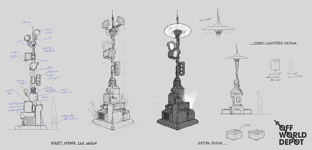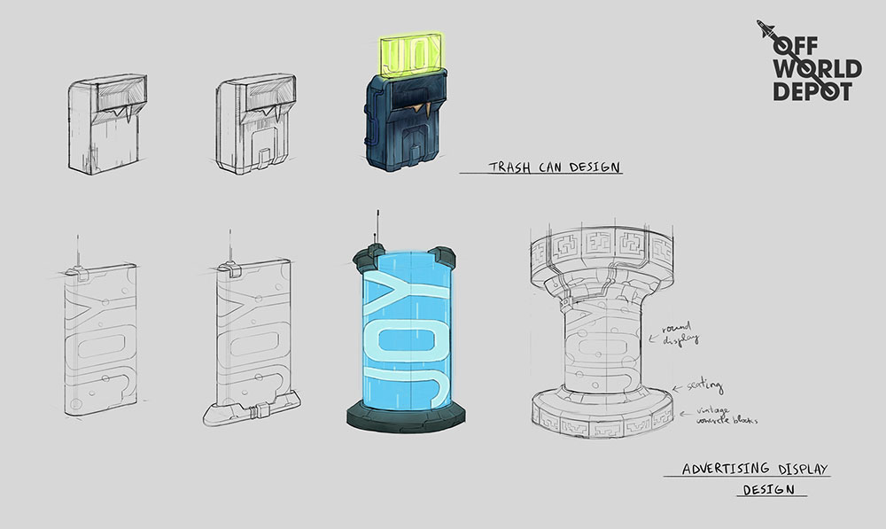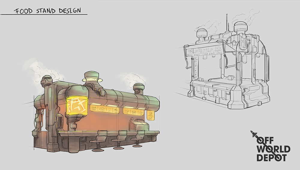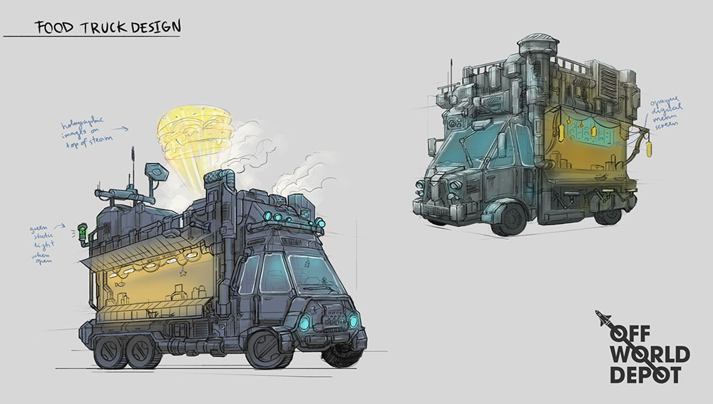 Concept design done for OFFWORLDDEPOT asset library. Sci-fi vehicle and props designs exploring a theme of city streets.